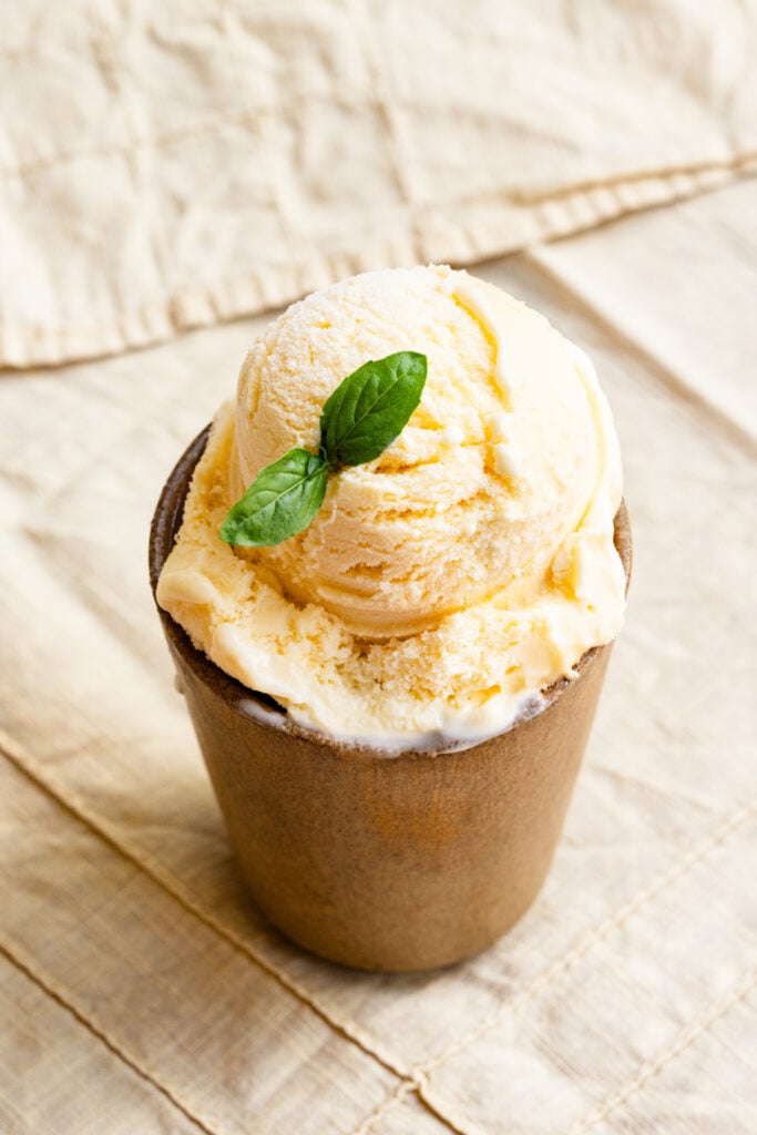 - Fresh Basil: Steeping the milk and cream with the basil, infuses a soft basil flavor to the ice cream, without overpowering the lemon.